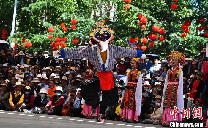 圖為2021年6月,西藏民間藏戲隊在宗角祿康公園表演。趙朗 攝