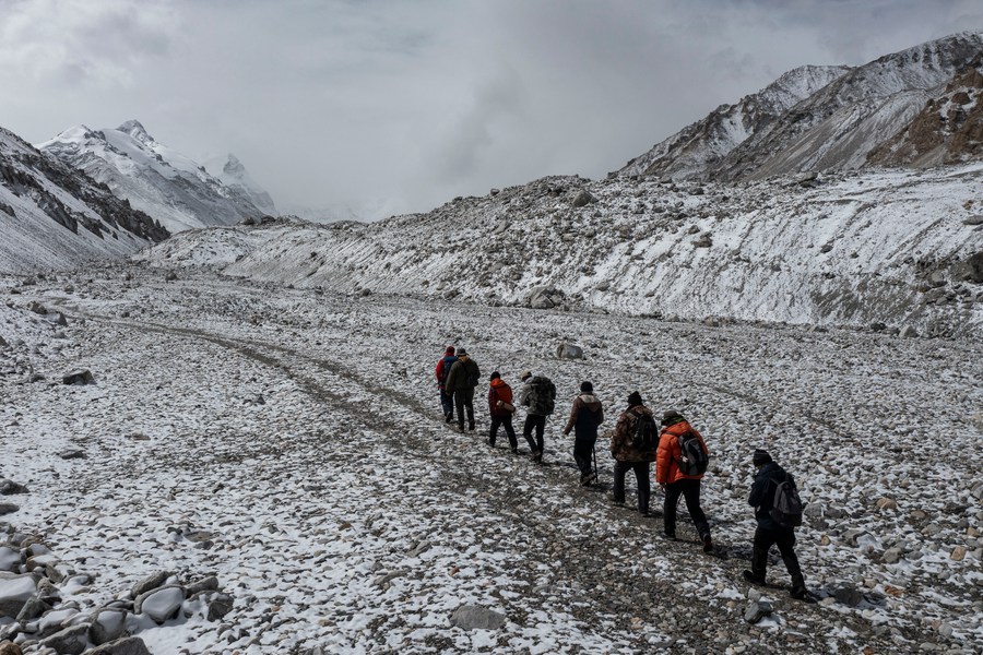 冰川與污染物小組在東絨布冰川觀察測(cè)量(5月6日攝,手機(jī)照片)。新華社發(fā)(受訪者供圖)