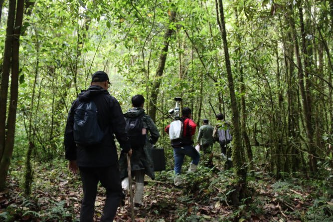圖為測量團隊進入森林腹地進行實地測量。(受訪者供圖)