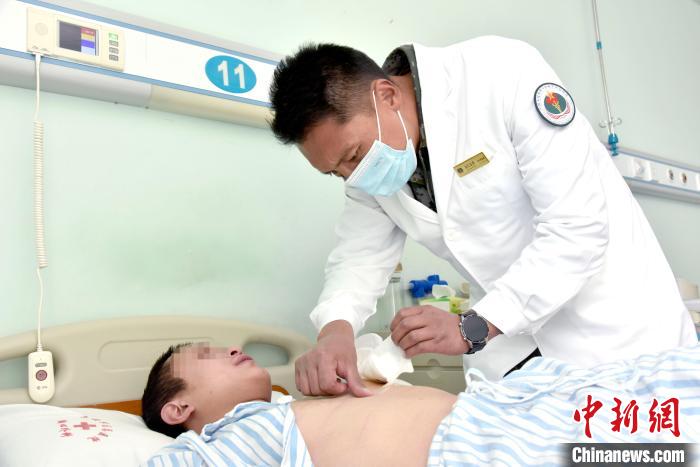 圖為西藏軍區(qū)總醫(yī)院胸科主任副主任醫(yī)師次仁云丹檢查患者小孔傷口恢復情況。李林 攝