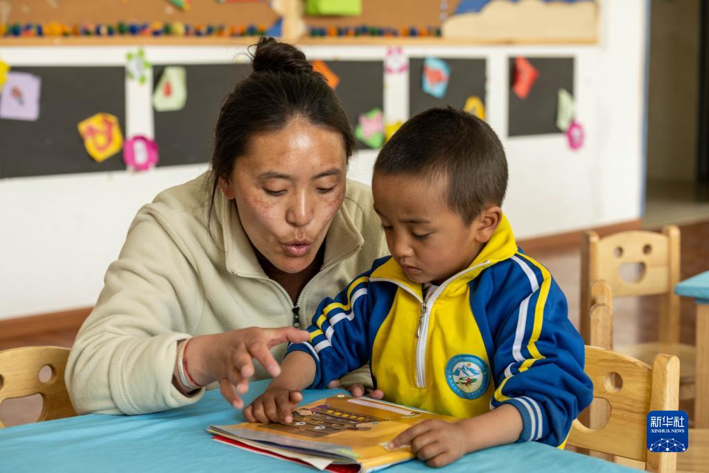 在西藏自治區(qū)山南市貢嘎縣森布日村,幼兒園老師教霍黨生讀書(shū)(3月22日攝)。新華社記者 周荻瀟 攝