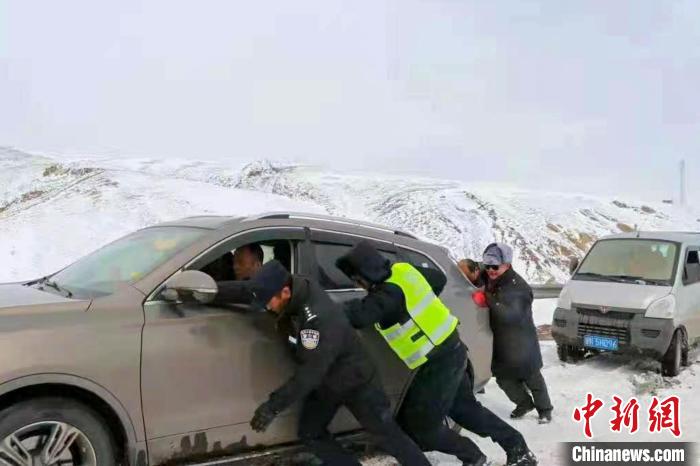 西藏安多交警為受困民眾推車(chē)。安多縣公安局交警大隊(duì) 供圖