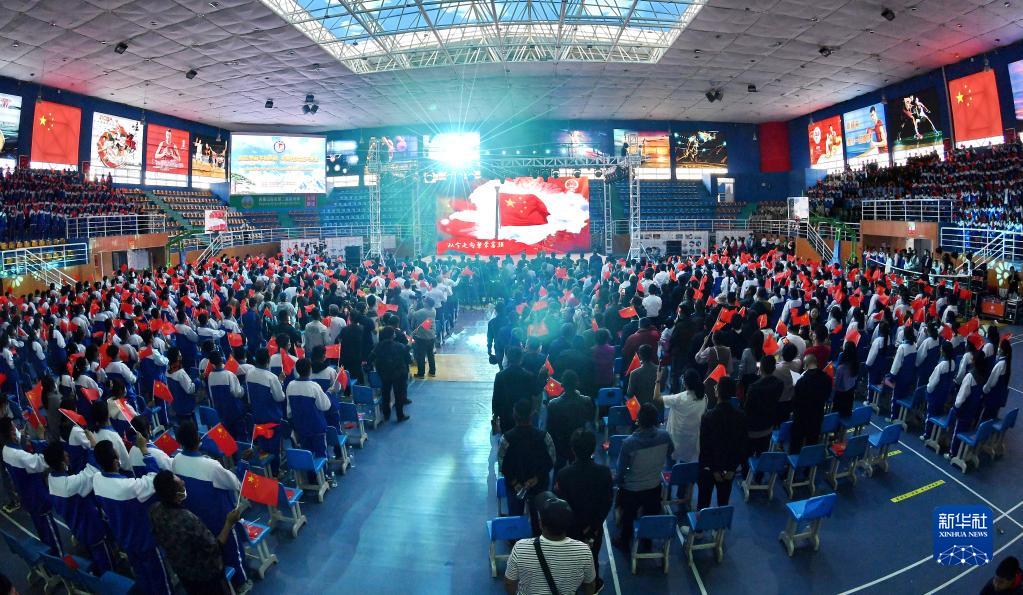 山南市第二高級中學學生在體育館觀看中華詩文朗誦會(6月3日攝)。新華社記者 劉洲鵬 攝
