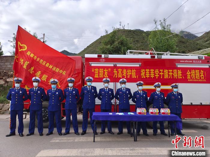 圖為消防指戰(zhàn)員為考生設(shè)立志愿服務(wù)點(diǎn)??ㄈ魠^(qū)森林消防中隊(duì) 攝