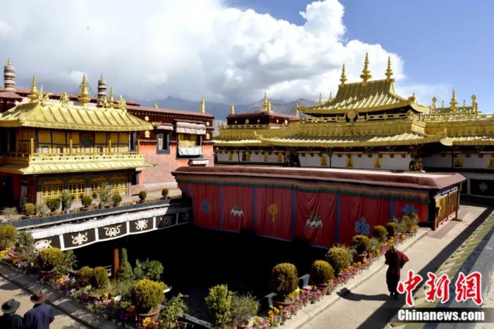 2014年10月拍攝的大昭寺金頂。大昭寺是西藏重大佛事活動的中心,“噶廈”政府的機構(gòu)設(shè)于寺內(nèi)。許多重大的政治、宗教活動,如“金瓶掣簽”等都在這里進(jìn)行。中新社記者 李林 攝