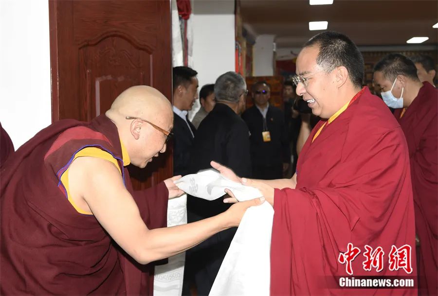 6月2日,班禪與藏傳佛教噶舉派高僧座談前,噶舉派高僧向班禪(圖右)敬獻哈達。中新社發(fā) 李林 攝