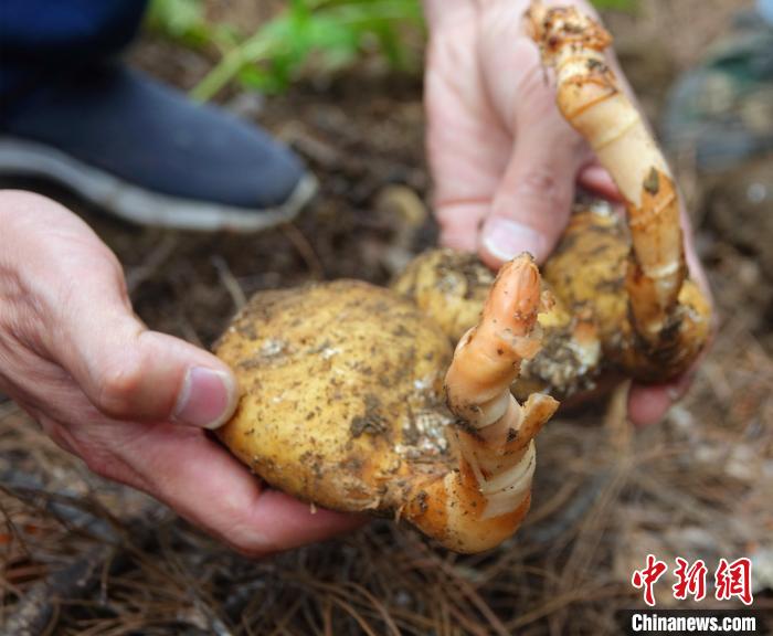 圖為工作人員展示藏天麻種植基地撫育的天麻?!∪轿木?攝