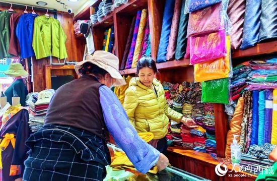 顧客正在卓瑪?shù)牟匮b店挑選服裝。人民網(wǎng) 李海霞攝