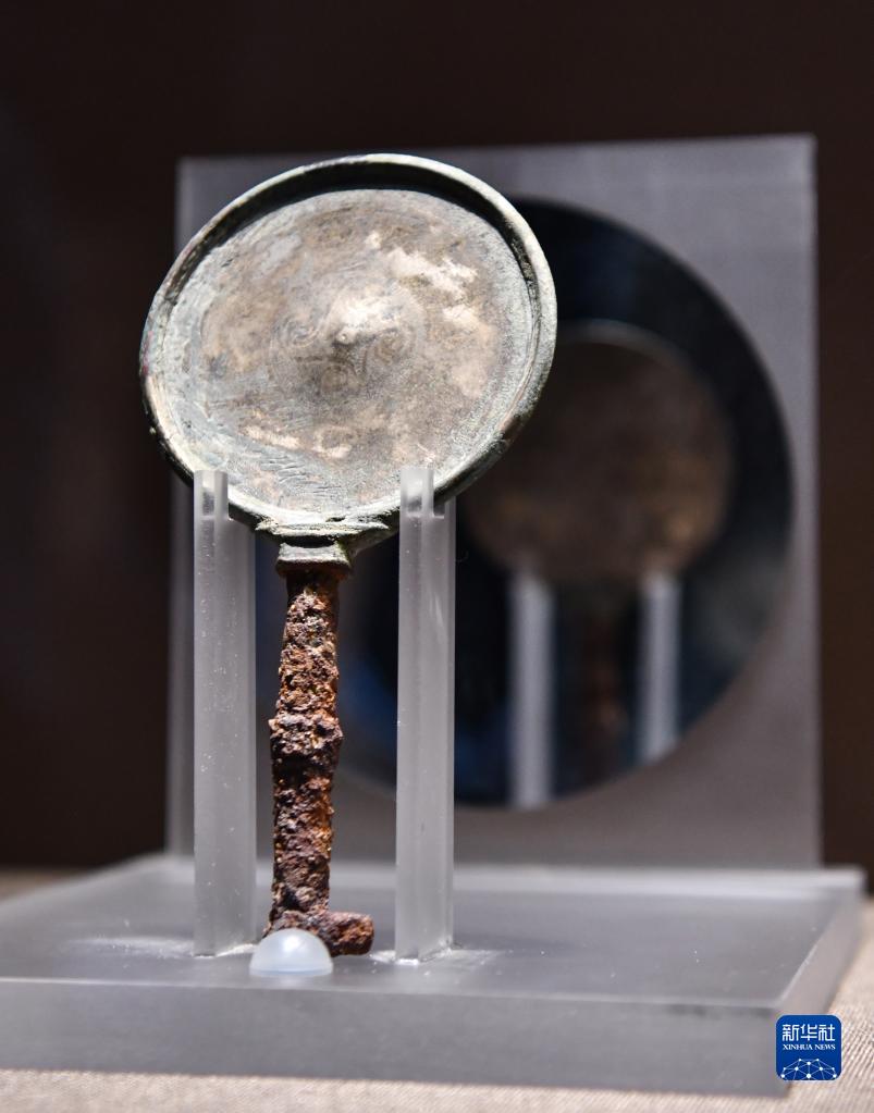 這是6月29日拍攝的西藏博物館新館展品——早期金屬時(shí)代的鐵柄銅鏡。該銅鏡出土于拉薩曲貢遺址,鏡體為銅質(zhì),柄為鐵質(zhì),鏡背飾雙鳥(niǎo)、卷草紋,似有牦牛圖象。新華社記者 晉美多吉 攝