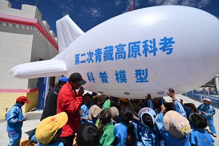 中科院珠峰站觀測主管席振華(左四)為小朋友們講解浮空艇原理