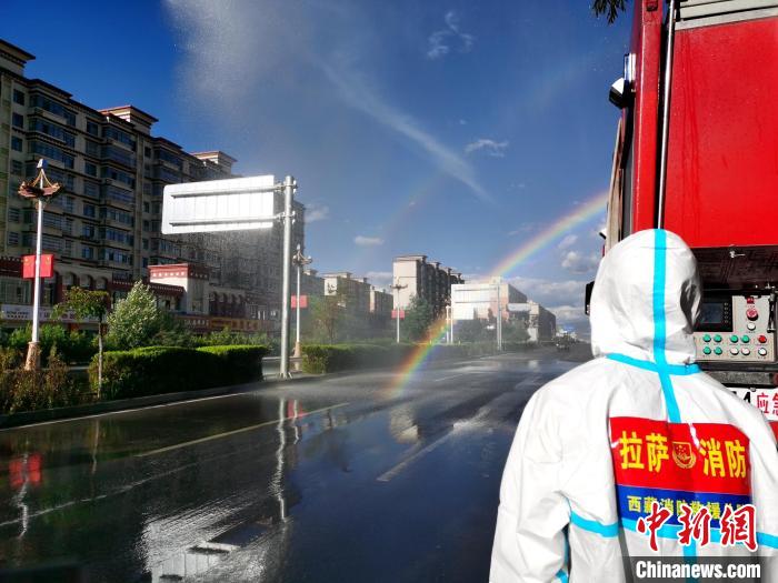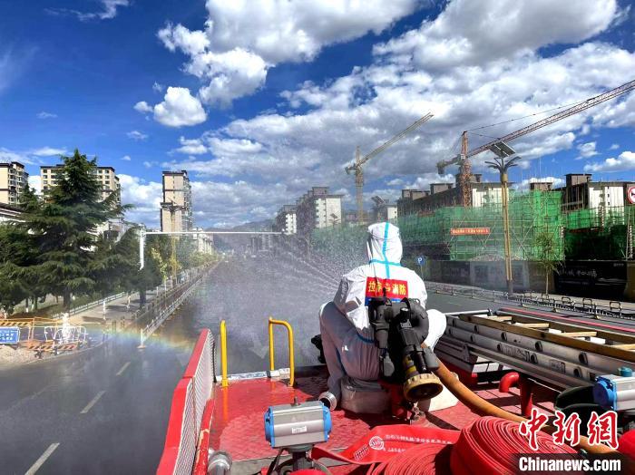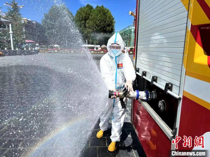 圖為拉薩消防指戰(zhàn)員在主城區(qū)進(jìn)行消殺?!±_市消防救援支隊(duì) 攝