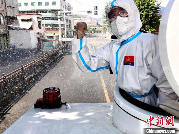 圖為拉薩消防指戰(zhàn)員在主城區(qū)街道進(jìn)行消殺?!±_市消防救援支隊(duì) 攝