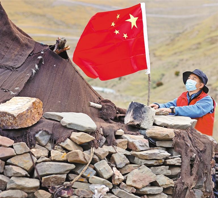 圖為山南市瓊結(jié)縣加麻鄉(xiāng)特日村駐村工作隊幫助牧民更換國旗。 通訊員 倫珠澤仁 記者 次旺 攝