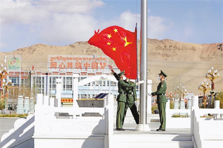 拉薩市堆龍德慶區(qū)的門堆村和崗吉村組織全體村干部舉行線上線下升國旗儀式,鮮艷的五星紅旗冉冉升起,飄揚在村委會上空。嘹亮的國歌聲中,鮮艷的國旗下,莊嚴肅穆的氛圍里,熱愛祖國、奮發(fā)圖強的情感在每個人心中激蕩。
