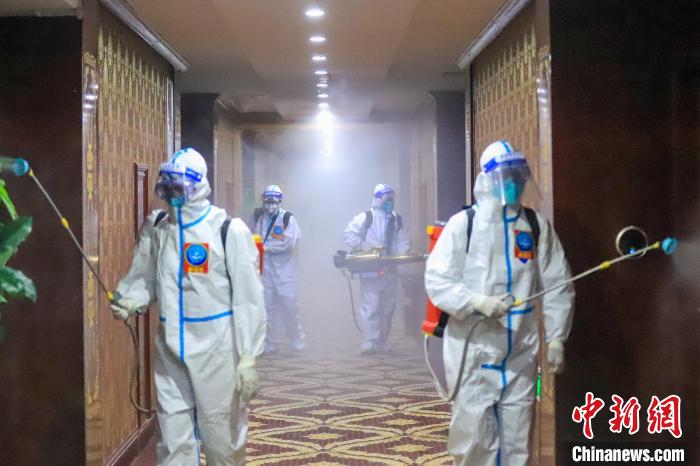 西藏森林消防隊員對隔離酒店進行覆蓋式消殺?!∥鞑厣窒揽傟?供圖