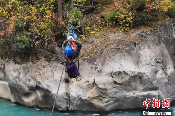 看到具美丹增安全抵達(dá)對岸后,陳來尼瑪拿出一條事先準(zhǔn)備好的尼龍繩,系在了朗尼的安全帶上。