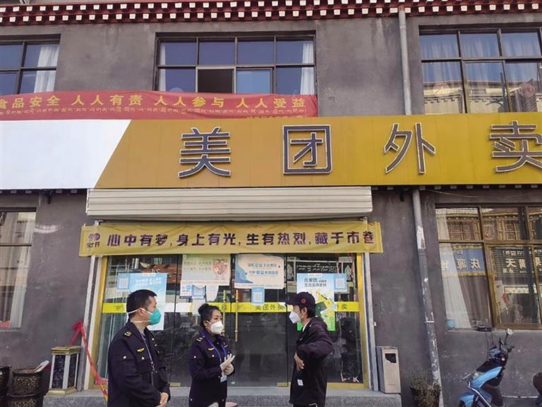 拉薩市市場(chǎng)監(jiān)管局對(duì)美團(tuán)拉薩分公司進(jìn)行現(xiàn)場(chǎng)指導(dǎo)。圖由 拉薩市市場(chǎng)監(jiān)管局 提供
