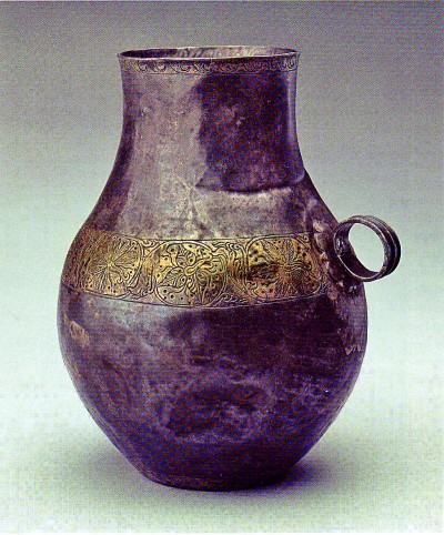 青海大通上孫家寨墓地出土的帕提亞風格鍍金銀壺。青海省文物考古研究所供圖