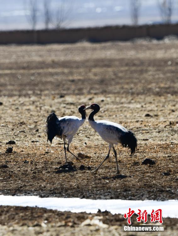 每年的10月底,成群的黑頸鶴飛到西藏拉薩市林周縣越冬,在拉薩市林周縣周邊的湖泊濕地度過(guò)5個(gè)月的“閑云野鶴”生活,次年三四月份再飛向藏北草原繁殖。黑頸鶴是世界上唯一一種高原鶴類(lèi)。具有足長(zhǎng)、喙長(zhǎng)、頸長(zhǎng)的典型涉禽類(lèi)特征,適合在沼澤地里行走。黑頸鶴的頸、尾為黑色,體羽為灰白色。黑頸鶴是國(guó)家一級(jí)保護(hù)動(dòng)物。目前,每年到林周縣越冬的黑頸鶴已達(dá)2000只左右。圖為黑頸鶴在林周境內(nèi)的農(nóng)田里覓食、嬉戲。 貢嘎來(lái)松 攝