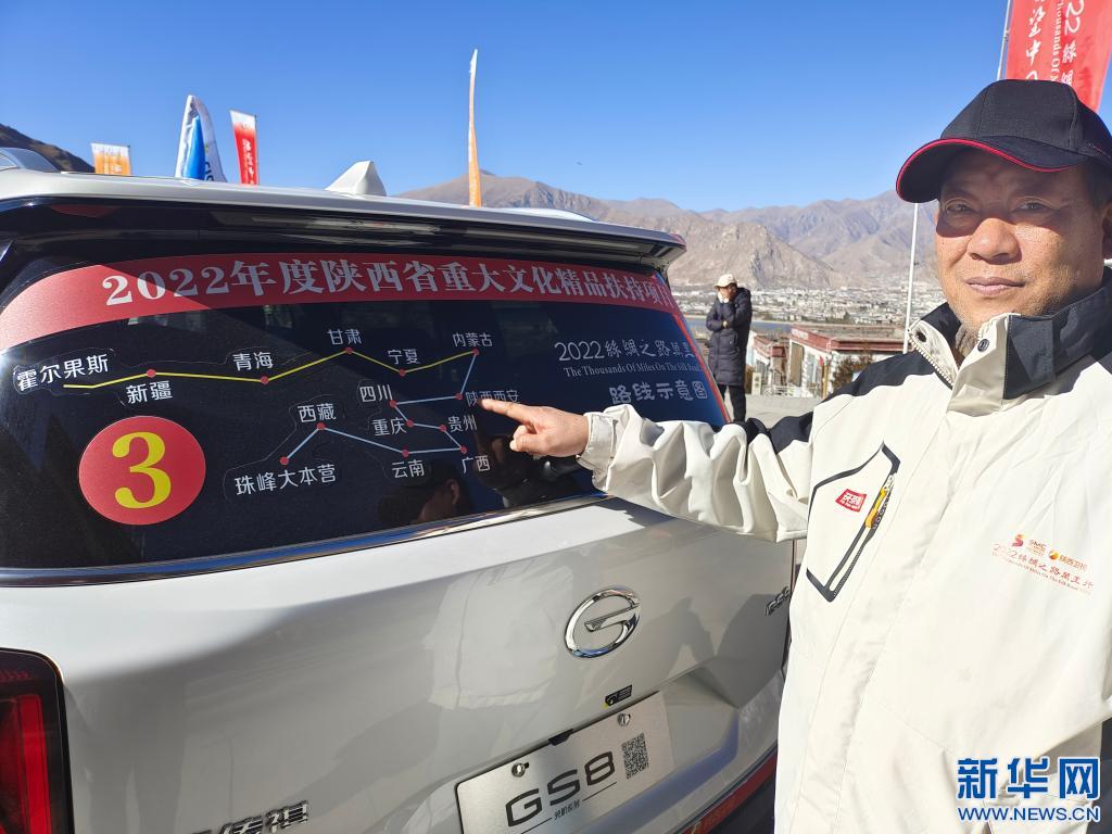 在拉薩市文成公主實景劇場前的廣場上,一列車隊緩緩駛過。有人從天窗探出身子揮舞著旗幟,旗上寫著:“2022絲綢之路萬里行,西望中國”。