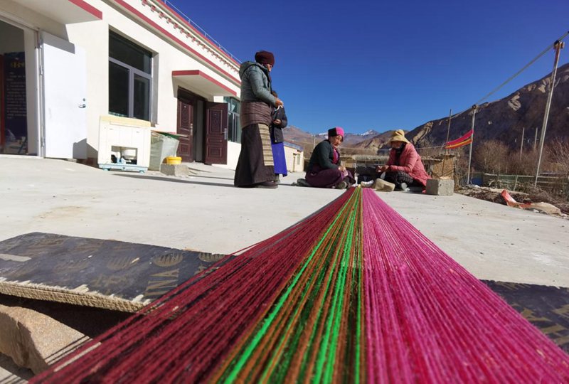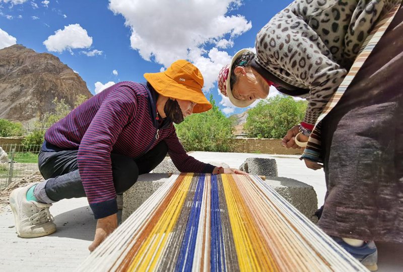 冬日的雅江水依舊奔流不息,陽光灑進(jìn)編織坊里,五彩梭線來回穿梭,阿佳們一邊忙活一邊哼唱?dú)g樂的歌曲。“我們這兒的特色就是歡樂。”次仁曲珍笑著說。