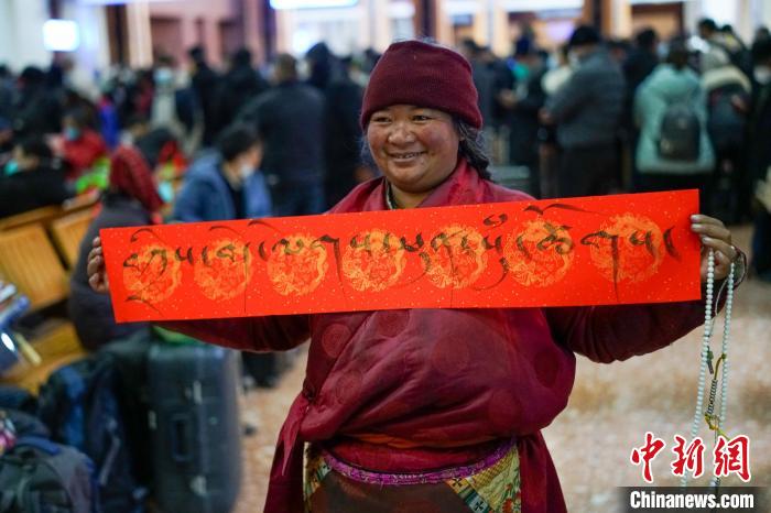 圖為春運首日,拉薩火車站一旅客獲得車站送的藏式春聯(lián),上面書寫的是藏語“扎西德勒 吉祥如意”。 江飛波 攝
