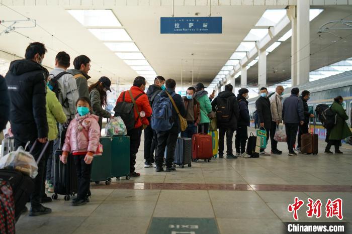 春運第一天,旅客在拉薩站排隊乘車?!〗w波 攝