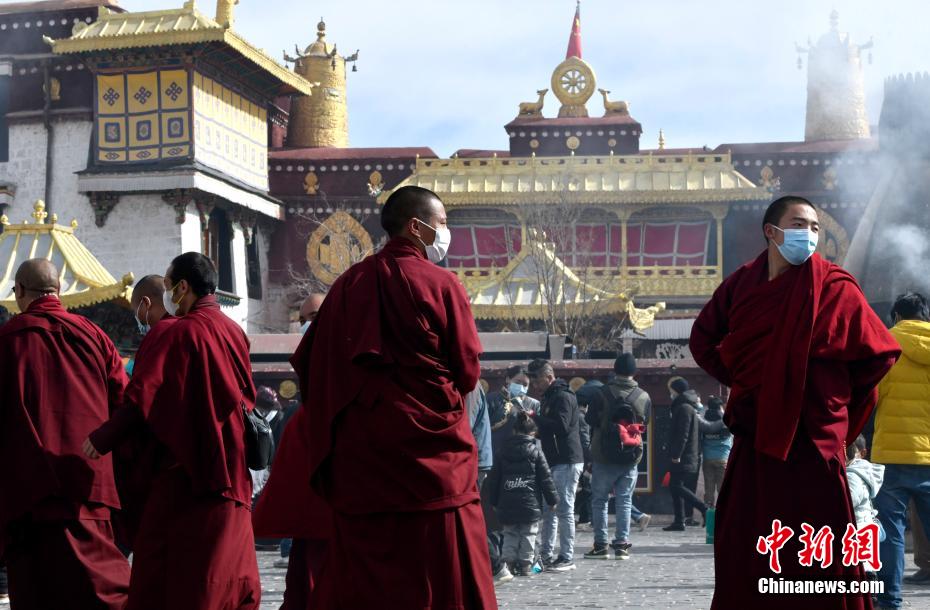 1月12日,西藏拉薩,來(lái)自青海玉樹(shù)的僧人們正在大昭寺前準(zhǔn)備合影留念。 李林 攝