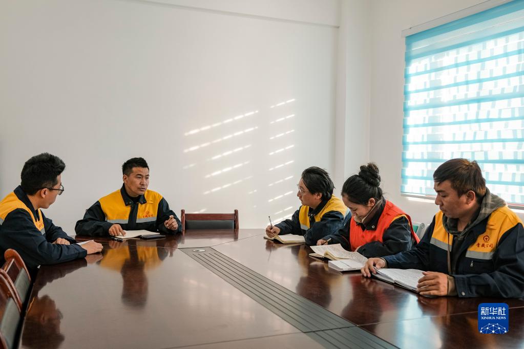 羅布(左二)在班前會(huì)上給鋼軌探傷隊(duì)員進(jìn)行任務(wù)部署和安全警示(1月12日攝)。新華社記者 孫非 攝