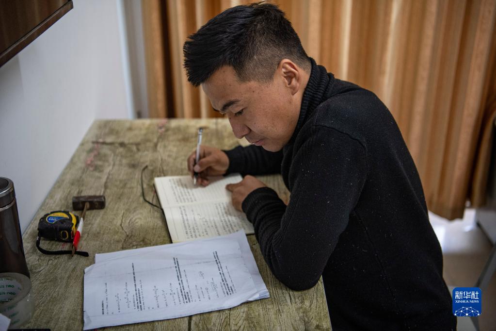 在拉林鐵路扎囊工電綜合工區(qū)的宿舍里,羅布在進(jìn)行業(yè)務(wù)學(xué)習(xí)(1月12日攝)。新華社記者 孫非 攝
