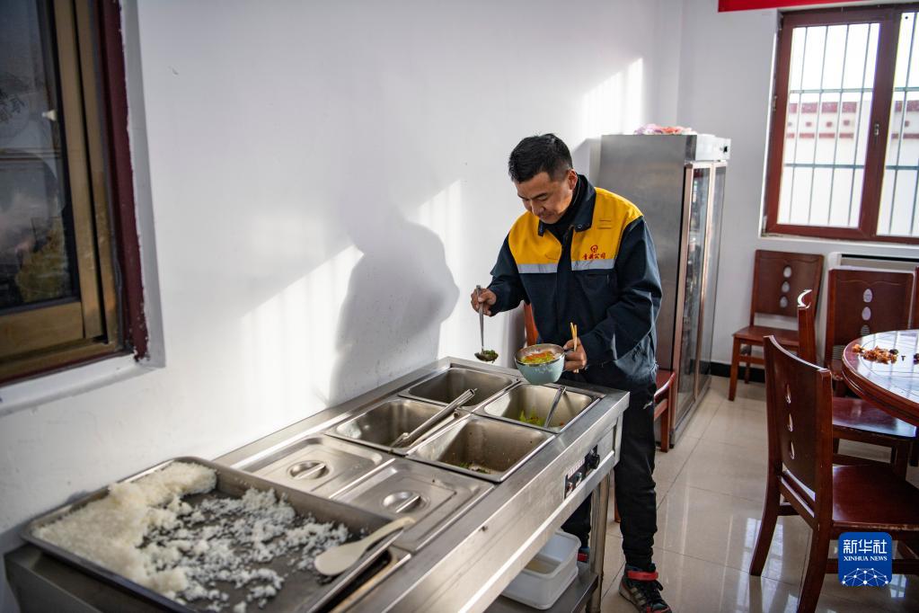 在拉林鐵路扎囊工電綜合工區(qū),羅布在打飯(1月12日攝)。新華社記者 孫非 攝
