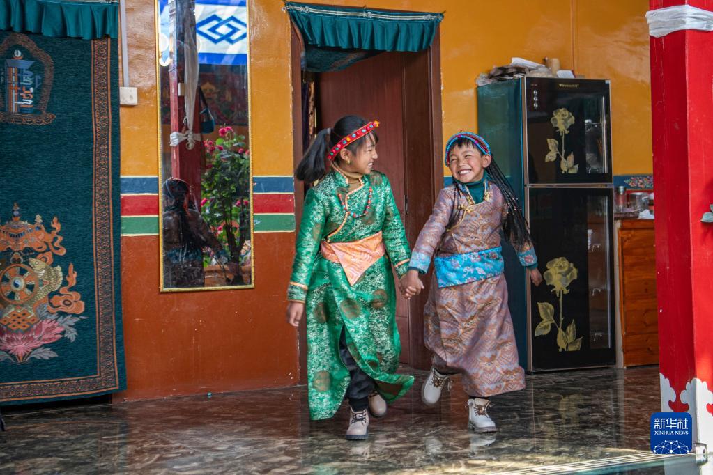 今年,日喀則藏歷農(nóng)家年和春節(jié)“巧遇”同一天,雖習俗不同,但年味皆濃。次旦的兒孫早早開車去縣城采買了年貨,兒媳婦們在家準備過年吃的羊頭、切瑪?shù)葌鹘y(tǒng)特色美食。家中的第四代,次旦老人的重孫子和重孫女們,則穿上了漂亮的藏裝,頭戴綠松石點綴的頭飾,在家中歡快地跑來跑去。