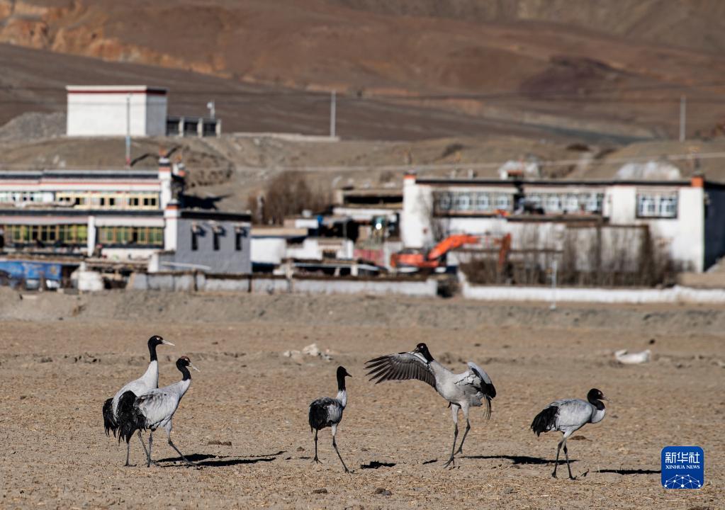 在西藏雅魯藏布江中游河谷黑頸鶴國家級(jí)自然保護(hù)區(qū)日喀則市拉孜縣越冬的黑頸鶴(1月23日攝)。新華社記者 晉美多吉 攝