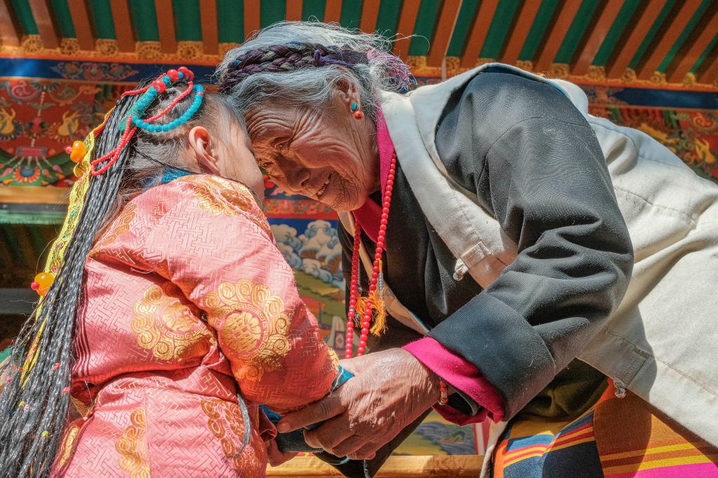 今年,西藏農(nóng)家年和春節(jié)“巧遇”同一天,習(xí)俗雖不同,但年味皆濃。從縣城買來的年貨,一家人制作的切瑪和卡塞(油炸面食)等傳統(tǒng)供品和食品,紛紛擺上了桌。第四代的孩子們,也換上了嶄新的藏裝,頭戴綠松石點(diǎn)綴的頭飾,依偎在祖奶奶次旦的身旁。