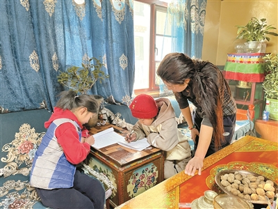 圖為三有村村民德吉正在輔導(dǎo)孩子做作業(yè)。拉薩融媒記者 莫瑞英攝