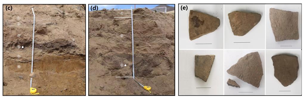 圖(c)(d)分別為共塘遺址調(diào)查剖面1和剖面2地層(三角形表示陶片位置)。圖(e)為本研究所分析的陶片照片。(資料圖片由第二次青藏科考隊(duì)“人類(lèi)活動(dòng)歷史及其影響”分隊(duì)提供)