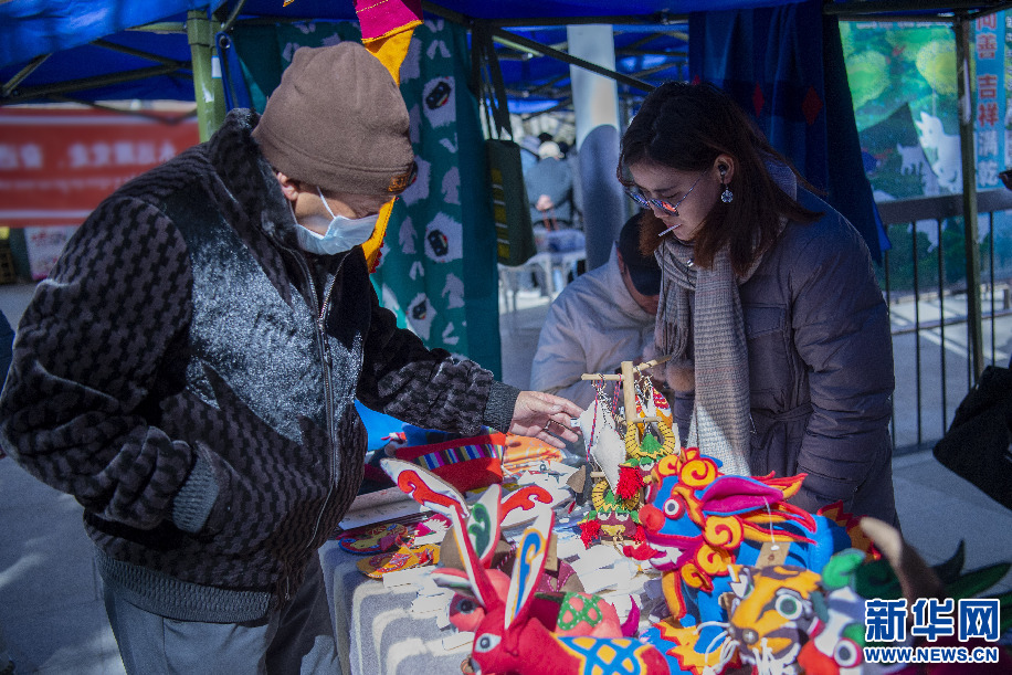 2月14日,群眾在直孔朗霞傳統(tǒng)針織加工專業(yè)合作社展位上挑選由傳統(tǒng)針織技藝制作的年貨。新華網(wǎng) 旦增努布 攝
