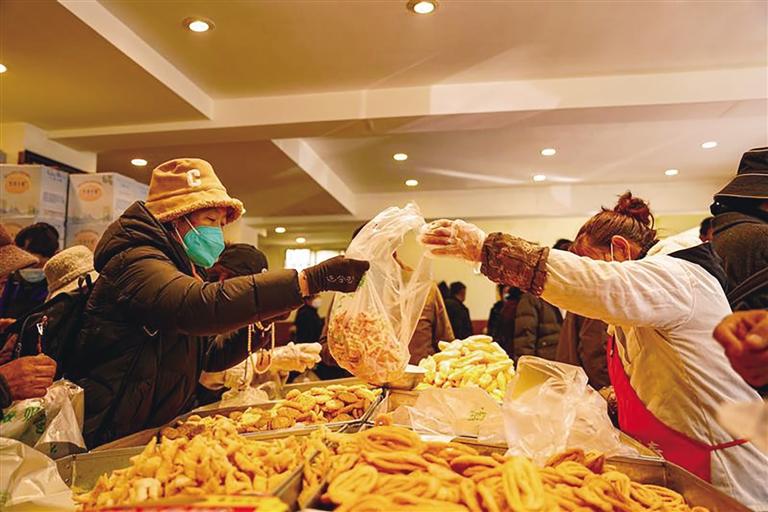 不遠(yuǎn)處,尼珍藏式卡塞店的店員們正忙著制作“卡塞”,揉面、切割、染色,面片經(jīng)店員們的巧手捏成長(zhǎng)條形、圓形、蝴蝶形等不同樣式,最后放到油鍋炸至金黃,出鍋后瀝油再撒上白糖,香甜可口、樣式精美的卡塞就制作完成了。新鮮出爐的卡塞顏色金黃、香氣四散開來,市民們爭(zhēng)相選購(gòu)。“我們做卡塞已經(jīng)25年了,今年1月10日開門營(yíng)業(yè),很多老顧客就來光顧了,每天收入在2000元至3000元之間,而且我們選用的原材料比較好,再加上現(xiàn)場(chǎng)制作、新鮮銷售,生意好的時(shí)候賣得更多?!崩习迥嵴涓嬖V記者:“我們店制作的卡塞價(jià)格實(shí)惠,連續(xù)8年沒有漲價(jià),每斤30元,今年準(zhǔn)備營(yíng)業(yè)到藏歷十二月二十九(公歷2月19日)歇業(yè)?!?/p>