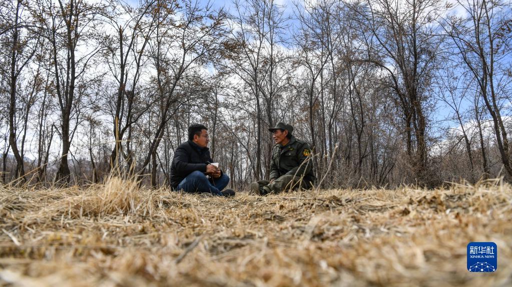 在西藏山南市隆子縣,扎西江村(左)與護林員在林中席地而坐,交流當(dāng)?shù)厣鷳B(tài)環(huán)境問題(2月14日攝)。新華社記者 晉美多吉 攝