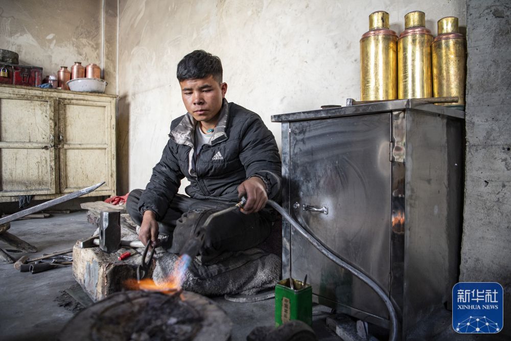 在扎西吉彩金銀銅器廠,手工藝人在給銀器鏨刻花紋(3月9日攝)。