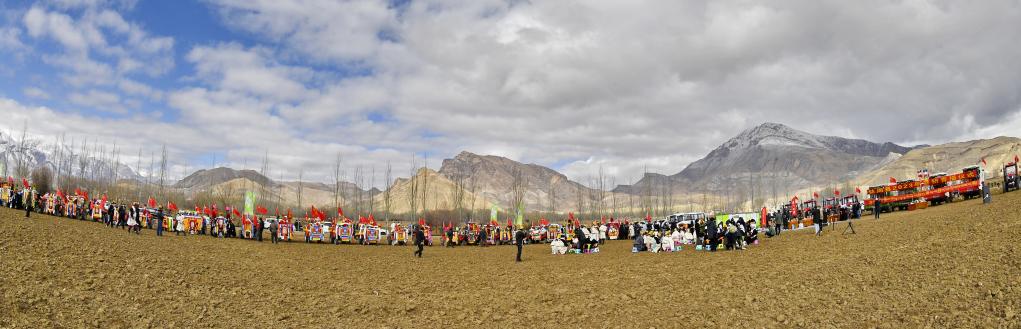 當(dāng)天是藏歷正月二十四日,據(jù)藏族天文歷算,是西藏農(nóng)區(qū)開(kāi)耕的日子。上午9時(shí)許,強(qiáng)嘎村村民身著盛裝,帶著青稞酒、酥油茶等物品聚在田間,共同舉行開(kāi)耕儀式。