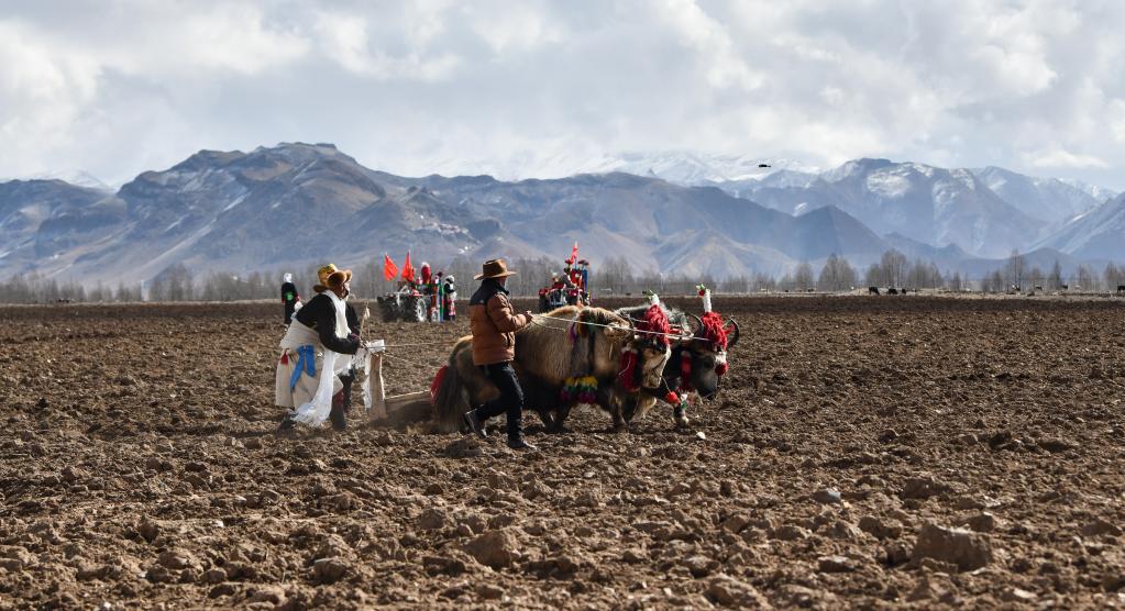 春耕儀式上,古老的“二牛抬杠”耕作方式已經(jīng)成為僅具象征意義的儀式(3月16日攝)。新華社記者 晉美多吉 攝