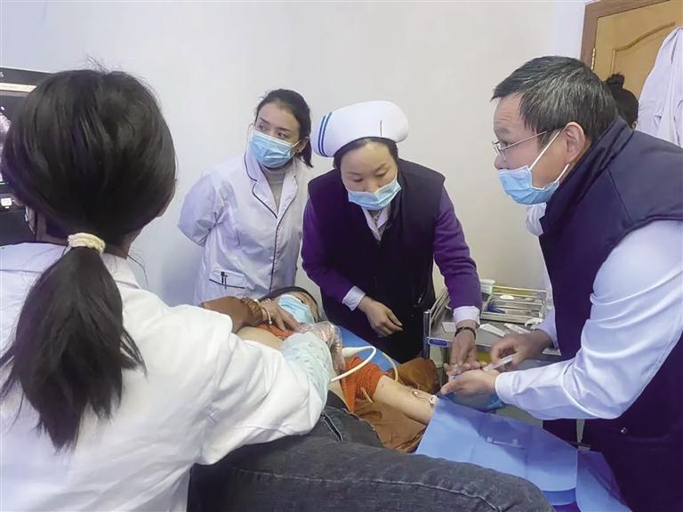 西藏自治區(qū)人民醫(yī)院超聲醫(yī)學(xué)科主任尼瑪玉珍操作超聲探頭(右二)。圖由西藏自治區(qū)人民醫(yī)院提供