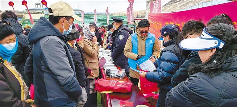 山南市錯那縣“鑄牢中華民族共同體意識 慶祝西藏百萬農(nóng)奴解放紀念日”活動現(xiàn)場,各宣傳點給群眾發(fā)放宣傳資料。記者 旦增蘭澤 攝