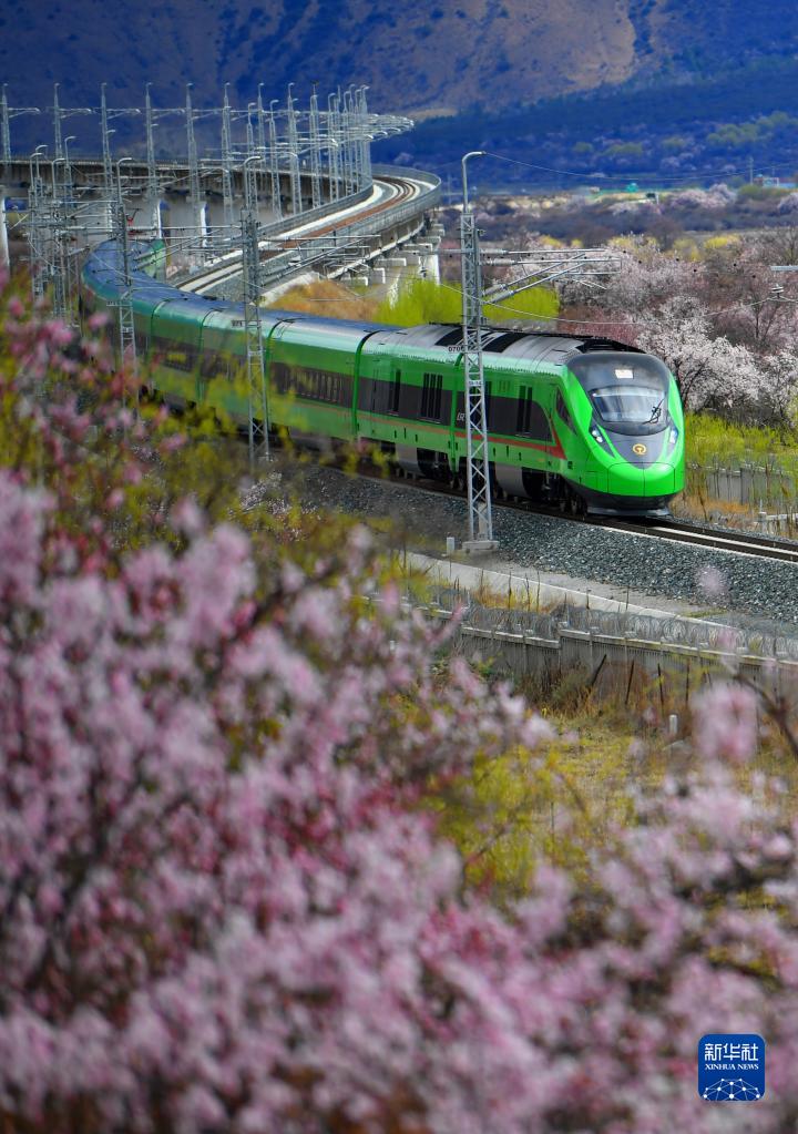 復(fù)興號(hào)穿行在西藏拉林鐵路林芝段的桃花間(2023年3月21日攝)。新華社記者 覺(jué)果 攝