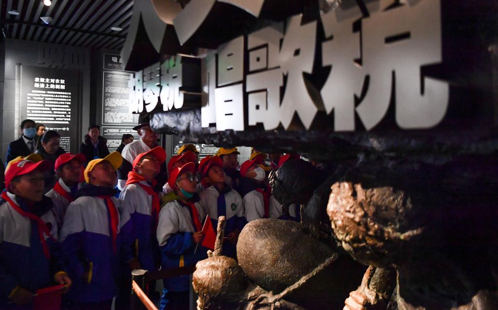 拉薩市堆龍德慶區(qū)乃瓊中心小學(xué)的學(xué)生在參觀西藏百萬農(nóng)奴解放紀(jì)念館(3月28日攝)。新華社記者晉美多吉 攝