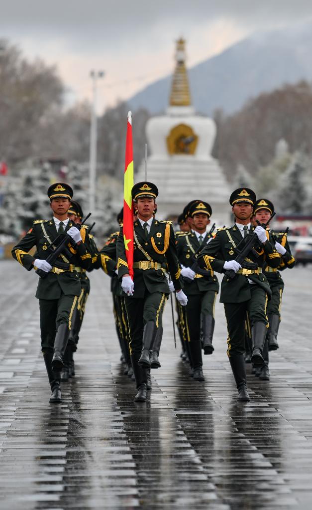 國旗護(hù)衛(wèi)隊邁著整齊劃一的步伐,把五星紅旗送到廣場升旗處(3月28日攝)。新華社記者晉美多吉 攝