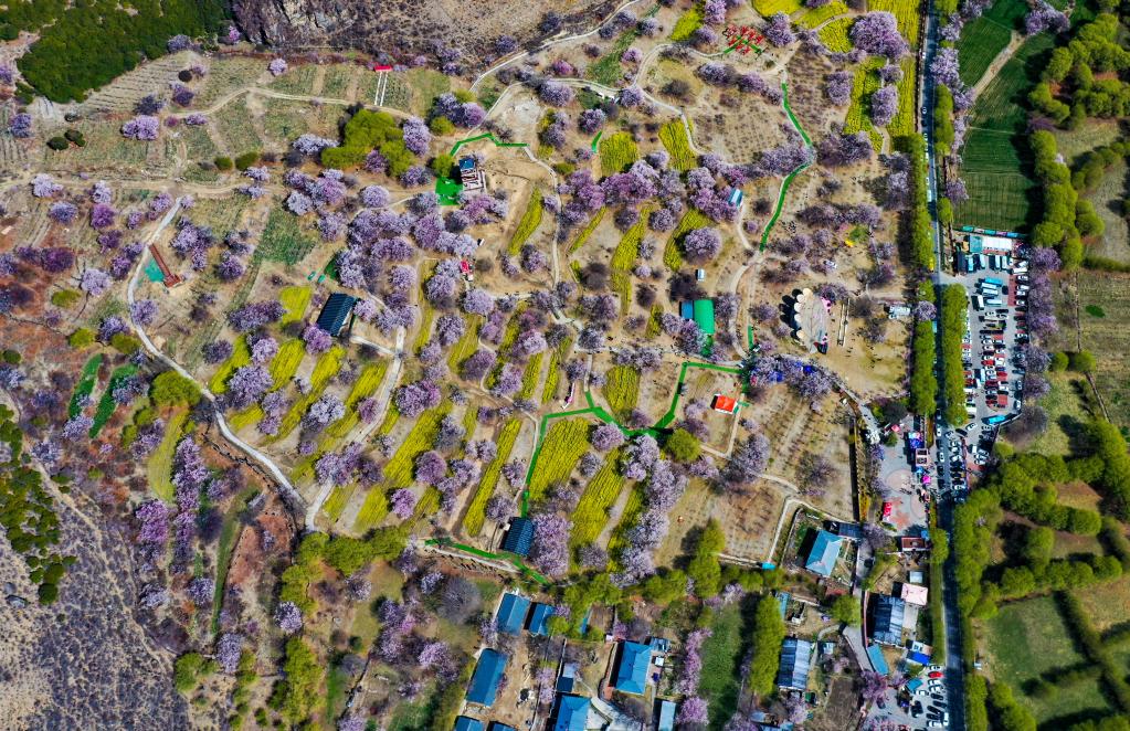 鳥(niǎo)瞰桃花盛開(kāi)的嘎拉村,停滿了旅游車輛(無(wú)人機(jī)照片,3月24日攝)。新華社記者 姜帆 攝