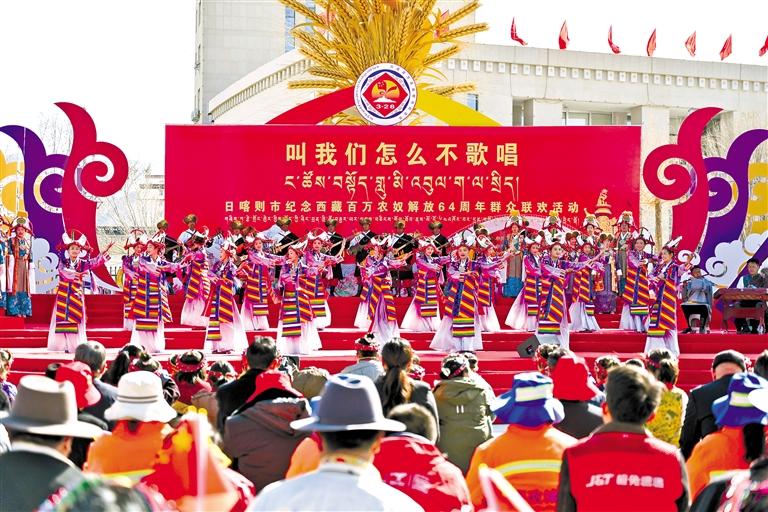 圖為為日喀則市紀念西藏百萬農(nóng)奴解放64周年群眾聯(lián)歡活動現(xiàn)場。