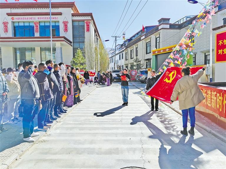 圖為桑珠孜區(qū)城東街道黨工委組織干部職工重溫入黨誓詞。